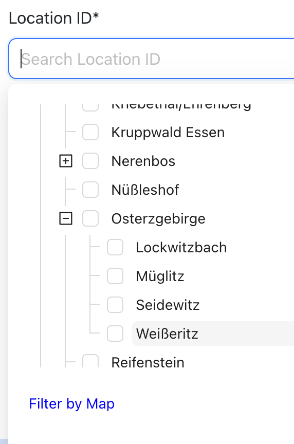 For comparison, here is an illustration of the existing hierarchy. The location “Osterzgebirge” should be on the same level as “Chemnitz”. The locations “Müglitz”, “Seidewitz”, “Weißeritz”, and “Lockwitzbach” should be structured under Osterzgebirge, just as “Ebersdorfer Wald”, etc. are under Chemnitz. Apologies for the misunderstanding.