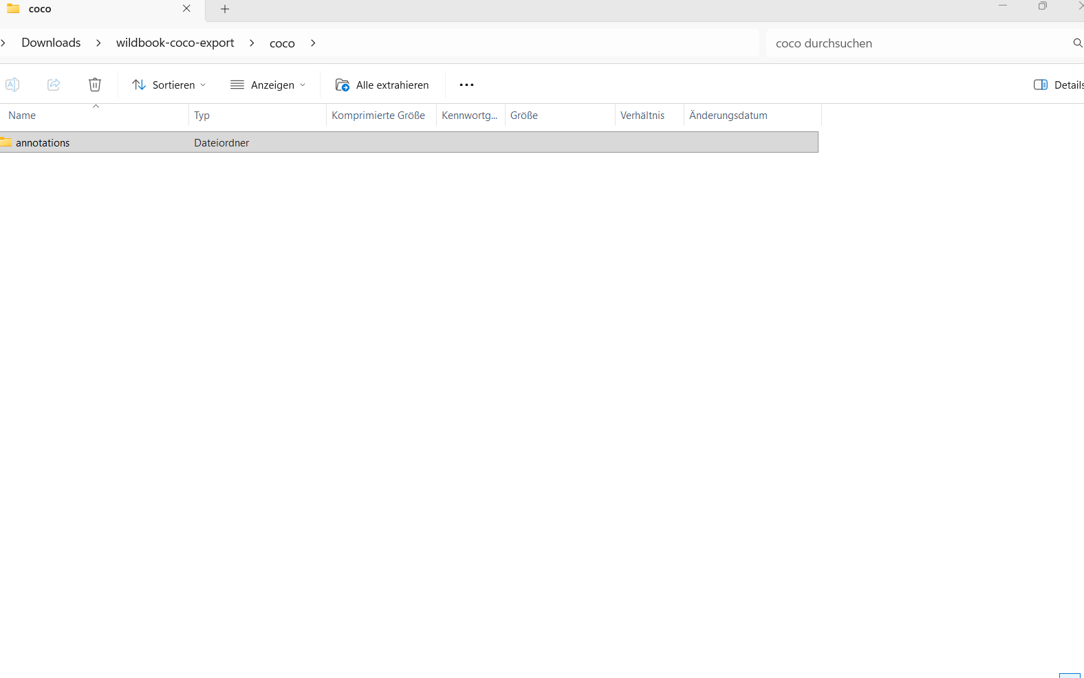 If I then click on export to download in COCO format, i get “wildbook-coco-export” folder. But I cannot open or extract this folder (the error messages are in German but they say something like “Folder cannot be opened”, “The folder is invalid” and when I click on extract: “The ZIP-compiled folder is empty”).