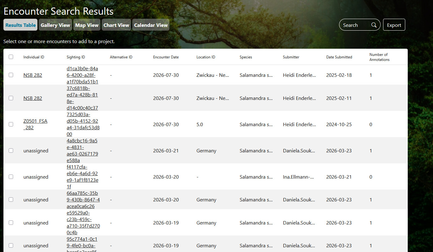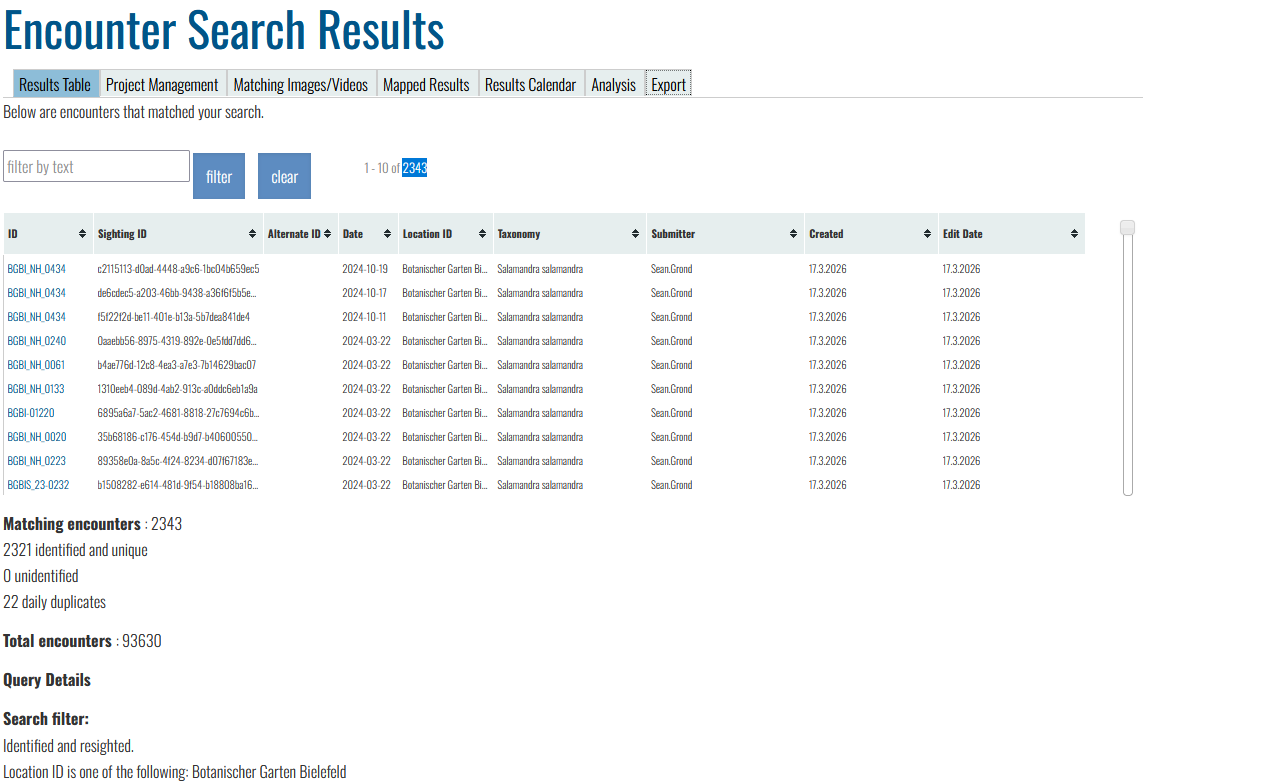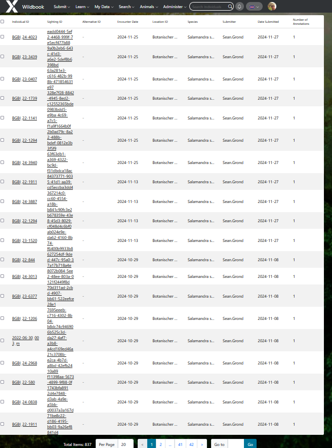 I would like to download images corresponding with encounters of fire salamanders previously uploaded to the ARW. I have an excel-sheet with the link to the encounter, e.g.: /var/lib/tomcat8/webapps/wildbook_data_dir/5/5/55370ffc-1adf-4e8d-bb54-7c60d633777e/BGBI243791.JPG . The excel-sheet was downloaded from an encounter search in the ARW and includes 2083 encounters. I tried recreating the encouter search using specific filters but ended up with more encounters (and I have my ideas why that is but that’s not the main problem). Also, I can’t directly download the images of the corresponding encounters from the encounter search. Is there a way to do so? I could provide you with the list of all links to each encounter. In theory, we could retrieve the images from our cloud severs and hard drives but they are located in hundreds of different folders, so I’m wondering if there is a faster more convenient way to get these images.