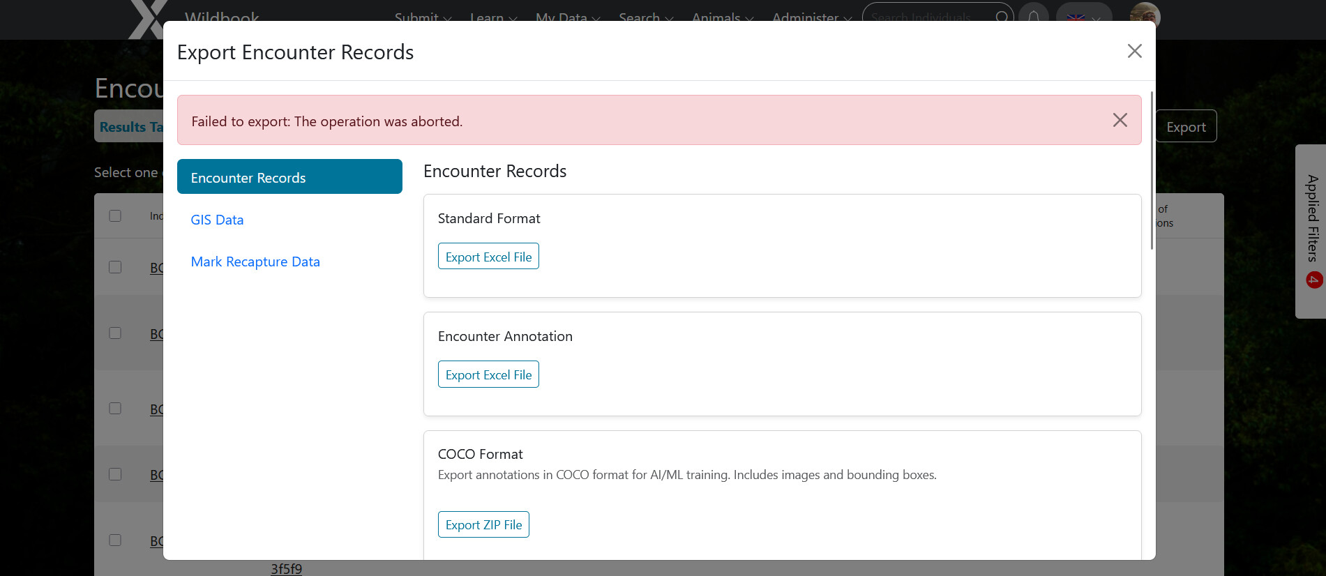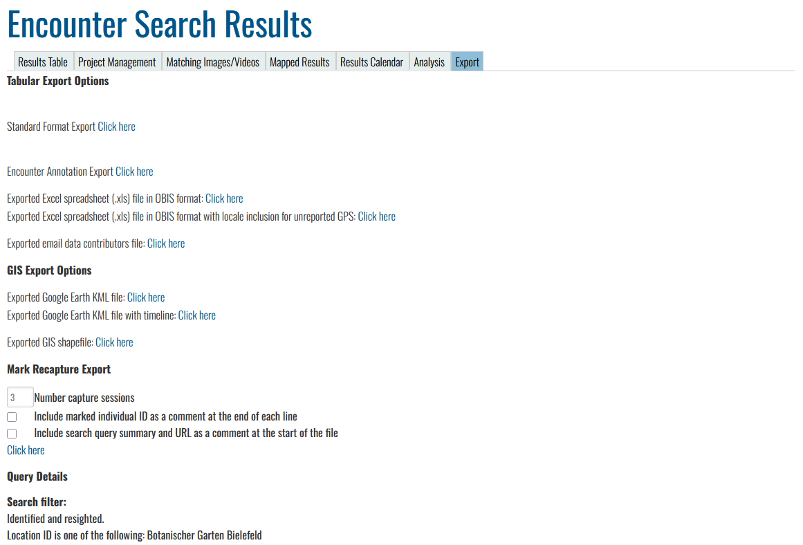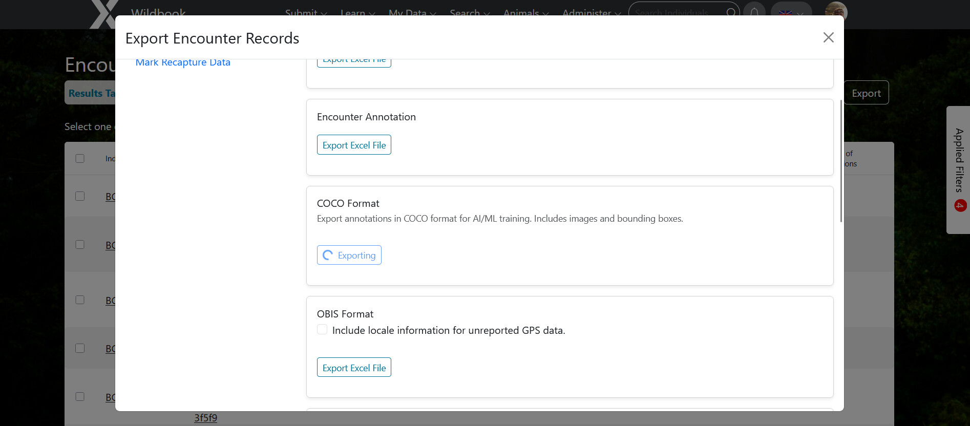 First, I tried the Classic search which yielded ~2300 encounters but there was no COCO export option. I tried the modern search thereafter and it only yielded ~800 encounters, so I do not know what happened there. I believe I used the same filters (timeframe, genus and species, location, only include individuals with 3 or more encounters. So I do not know why I get differetn results.