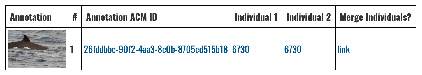 There’s also the Annotations Duplicated in Two or More Encounters tool which will also show you if any annotations that appear in multiple encounters and shows you whether or not those annotations have an ID. This is another way to scan for duplicate entries. It doesn’t include the link to merge any individuals, though.