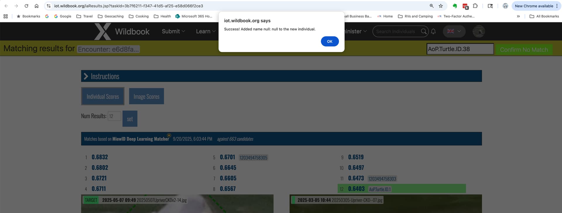What happened? Pop-up messasge after confirming no match does not include the name just assigned to the previously unidentified turtle - has ‘null’ instead. Including screenshot.
